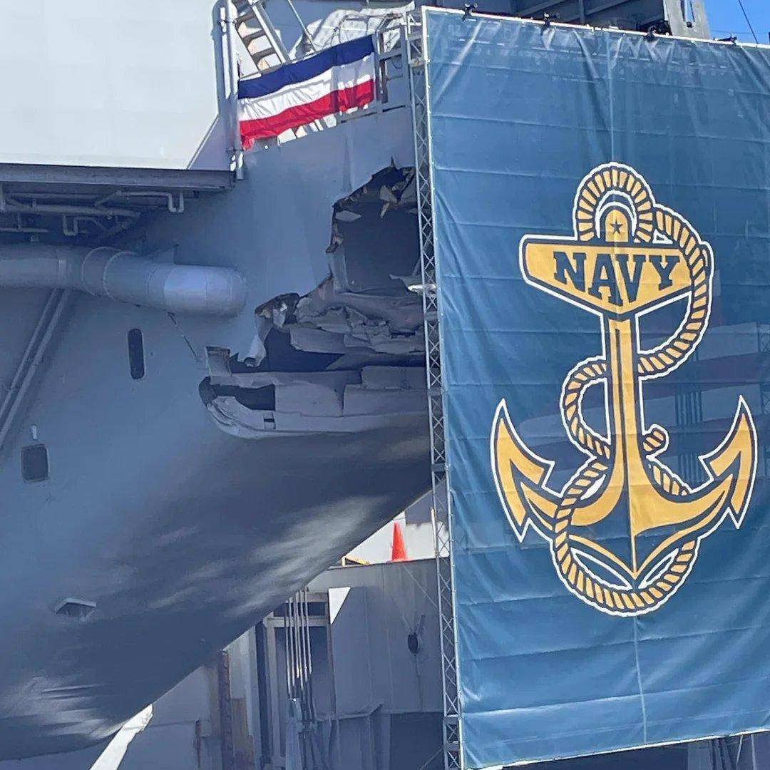 10月5日,特朗普出席美国海军成立250周年庆典活动,并以“杜鲁门”号为背景发表讲话。然后就是一次看似普通的讲话,却暴露出美国的命门。现场摄像机拍到杜鲁门号航母右舷尾部存在明显损伤,美国人用巨幅海军旗帜进行遮挡。